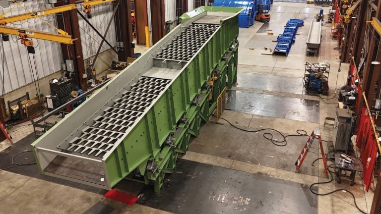 一台正在 General Kinematics 組裝中的雙質量振動篩,展現了該公司專注於可擴充且高效率回收解決方案的設計理念。(圖片來源:General Kinematics)