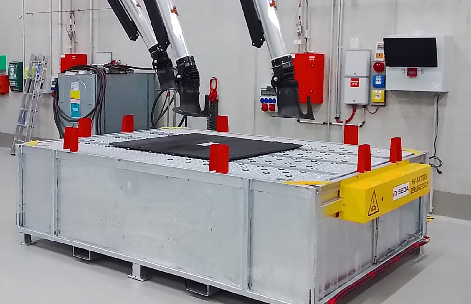該工作平台適用於受損與未受損的鋰離子儲能系統、高壓電池模組維修與拆解作業,提供安全且可靠的電池處理環境。