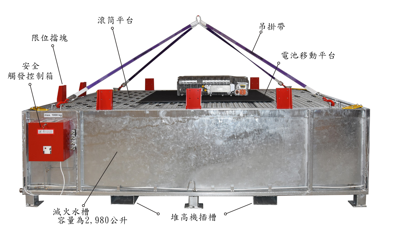 冷卻水槽設計可使用堆高機移動,方便事故電池後續處置。