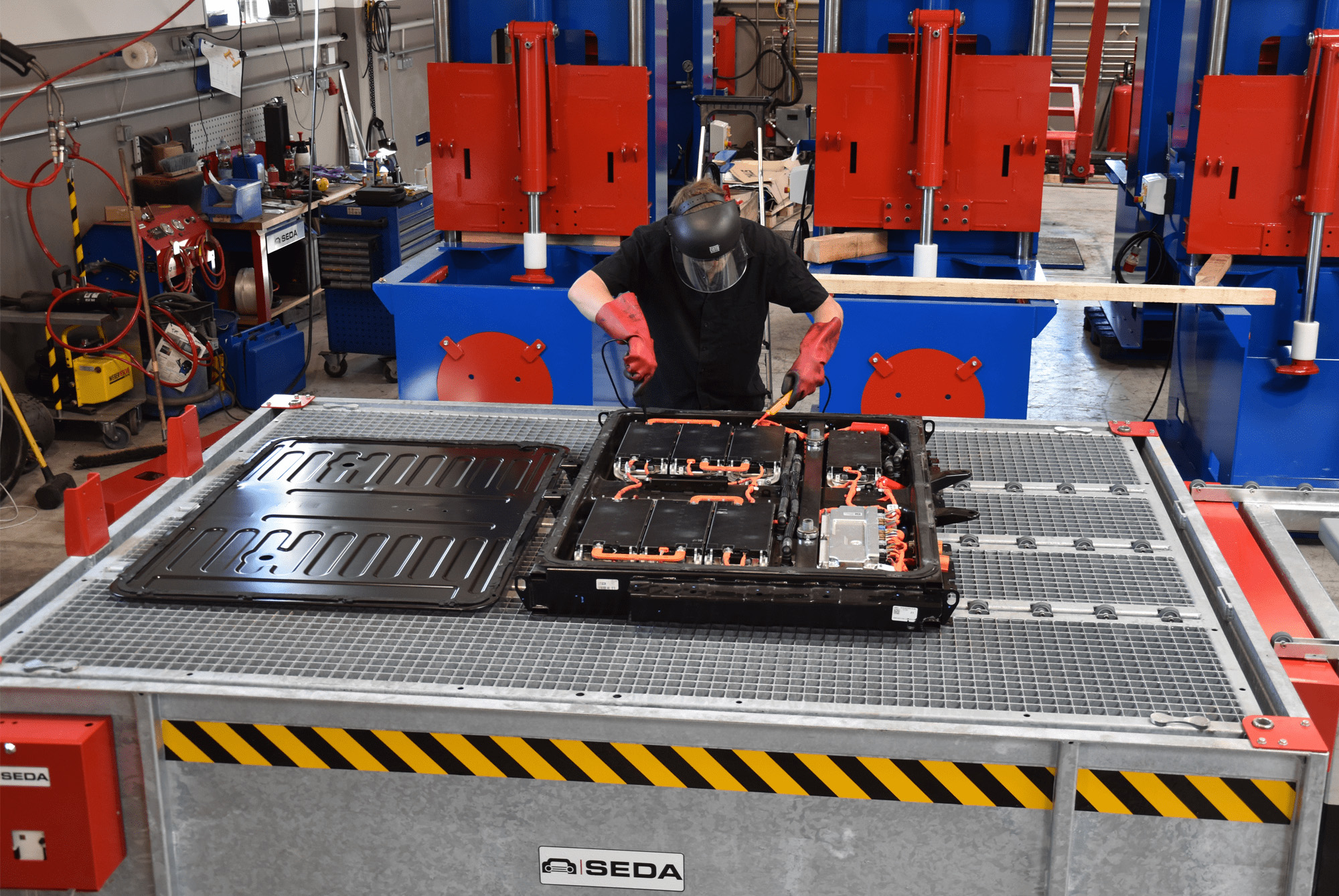 該工作平台適用於受損與未受損的鋰離子儲能系統、高壓電池模組維修與拆解作業,提供安全且可靠的電池處理環境。